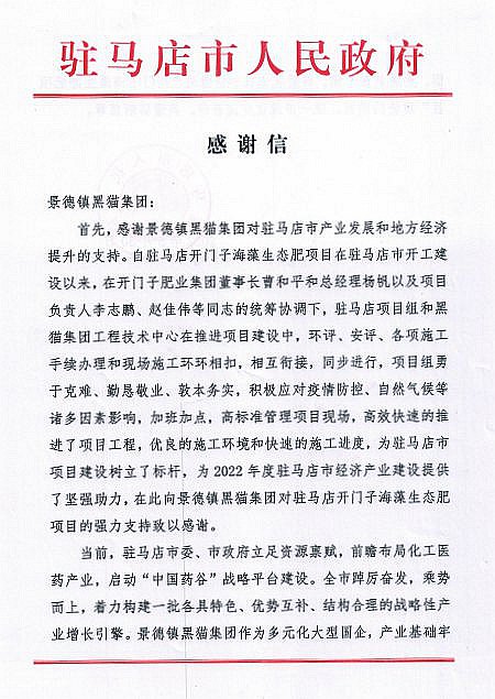 2022年以來(lái),黑貓集團(tuán)旗下開(kāi)門子肥業(yè)公司,克服疫情影響,積極推進(jìn)駐馬店海藻生態(tài)肥項(xiàng)目,為2022年度駐馬店市經(jīng)濟(jì)產(chǎn)業(yè)建設(shè)提供了堅(jiān)強(qiáng)助力,樹(shù)立了項(xiàng)目建設(shè)標(biāo)桿。為此,駐馬店市人民政府于5月30日致信黑貓集團(tuán)表示感謝!信中提到,黑貓集團(tuán)作為多元化大型國(guó)企,產(chǎn)業(yè)基礎(chǔ)牢固,發(fā)展前景廣闊,希望雙方在加快推進(jìn)項(xiàng)目建設(shè)的同時(shí),進(jìn)一步深化交流合作,共譜嶄新篇章。(文:李玉榮/編輯:余泰/一審:江威/二審:嚴(yán)春華/終審:盛旺喜)